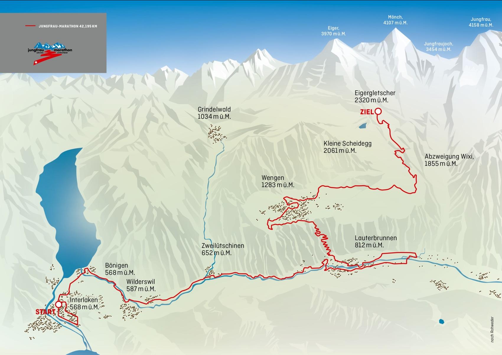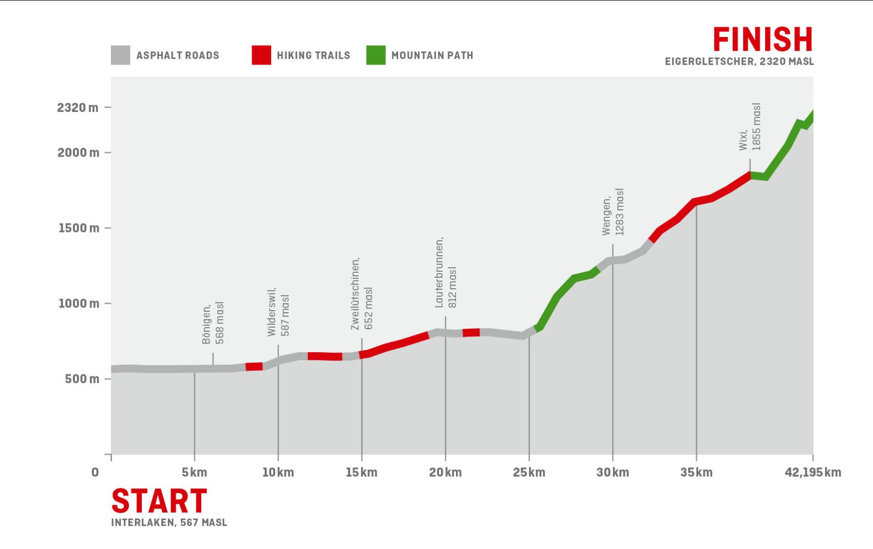 The start is in Interlaken at 565 meters above sea level. From there you climb steadily uphill, with constant views of imposing peaks such as the Eiger, Mönch and, of course, the Jungfrau. The finish is on the Kleine Scheidegg, at 2,095 meters above sea level, an unforgettable arrival in the middle of the high mountains.